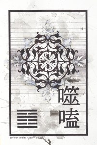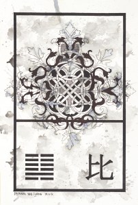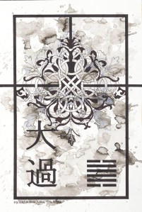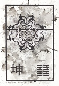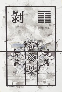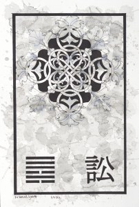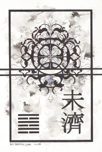 The order comes from the unifying elements of the I Ching project: a black framework border on watercolor paper, a hexagram, which is chosen at random at varying stages of the painting, along with the corresponding Chinese character. The chaos evolves from the biomorphic designs (some paintings are created entirely using these designs), the Celtic knots, and the final ink wash stage. The result creates a balance of decisive and delicate lines set against a background of intense shapes.